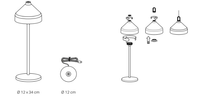 La lampe de table est fournie avec un capuchon en silicone et un crochet permettant de la transformer en suspension.